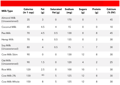 Nutritionally, all cow’s milk types provide similar protein, calcium, and vitamin D. The “best” choice depends on taste preference and health goals. It is important to read the label on alternate milks to find out how much calcium is added. More tips here.