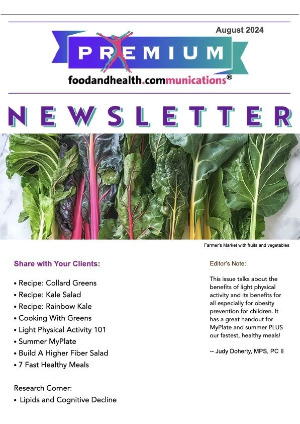 The August nutrition education newsletter is for health and nutrition professionals. It supplies a white-label newsletter, handouts, articles, and timely food and nutrition content. This issue covers b-vitamins, greens, niacin and heart research, dieting and heart research, and more.